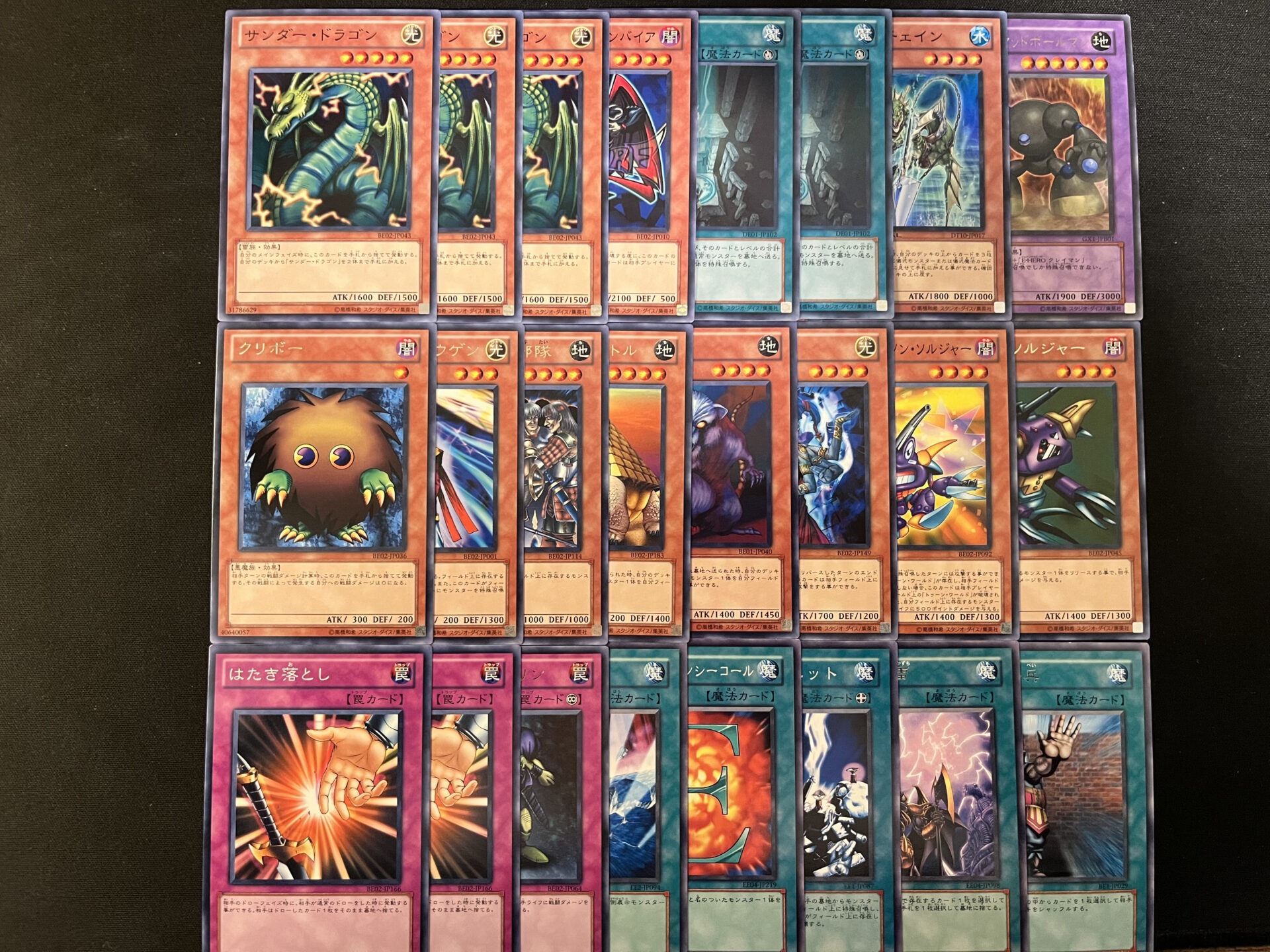 《奈落の落とし穴》のように[BE02-JP163]のスーパーレア収録まで長い期間ノーマルでしか収録されていないカードも存在します。画像右上の[DL5-083]は希少な型番で1枚1000円程度で取引きされることがあります。再録がたくさんあるカードでも型番に注目しながらストレージチェックをするとごく稀に希少型番を見つけることができます。